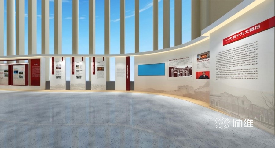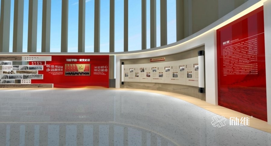 得益于得天獨(dú)厚的光線優(yōu)勢(shì),在實(shí)現(xiàn)路徑上,勵(lì)維決定設(shè)計(jì)一個(gè)不同于一般文化墻\長廊的黨建展區(qū),更多從最終效果的實(shí)現(xiàn)為出發(fā)點(diǎn),讓設(shè)計(jì)為其服務(wù)。