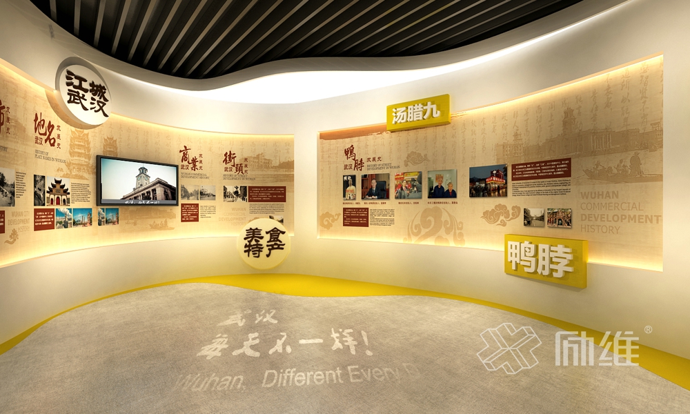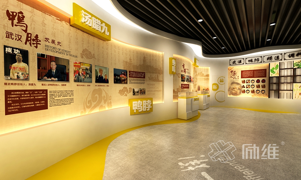 展館設(shè)計以企業(yè)形象窗口、合作交流平臺、培訓(xùn)教育基地為功能定位,通過展銷兩線并進,通過“以展促銷·以銷帶展”的設(shè)計理念,打造展銷一體化的鴨脖文化展覽館,內(nèi)容上通過溯源武漢城市歷史、武漢特色與風(fēng)情引出武漢鴨脖的發(fā)展史來展示武漢地方飲食文化特色及武漢鴨脖的文化流傳,在空間設(shè)計及風(fēng)格元素上,著重考慮鴨脖文化的特征屬性,以現(xiàn)代白結(jié)合企業(yè)VI黃深化企業(yè)特點和文化特征,同時以武漢地標(biāo)的藝術(shù)造型及文化剪影來深化地方特色,以藝術(shù)卷軸、文化浮雕、場景還原等多種展示手段營造展館獨特氛圍。